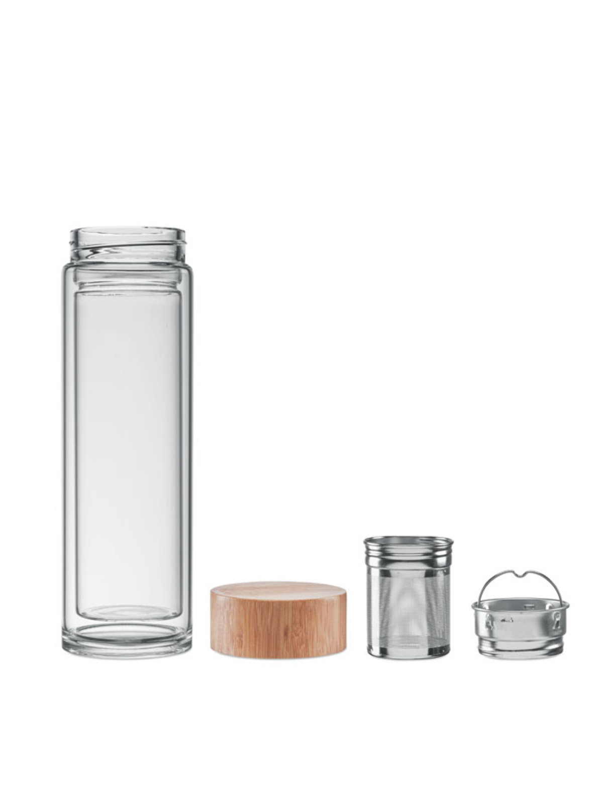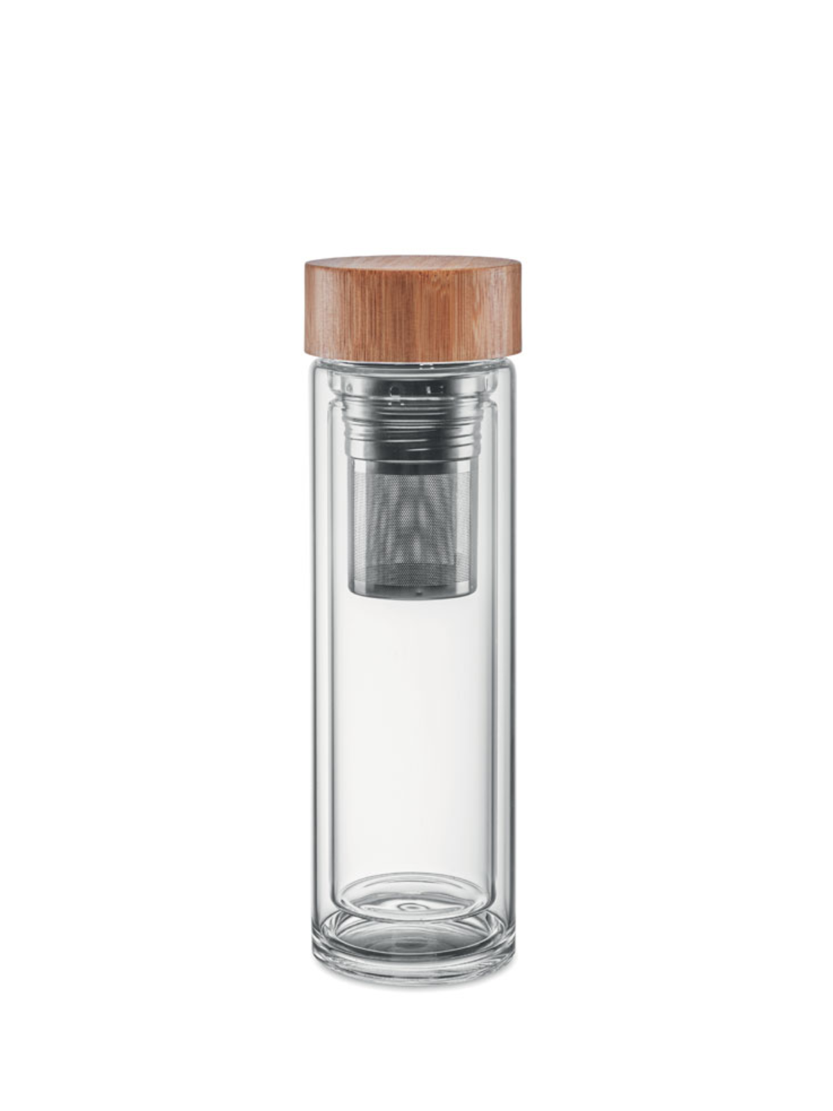 Bottiglia con doppio strato in vetro borosilicato e coperchio in bamboo. Con infusore per thè e antigoccia.