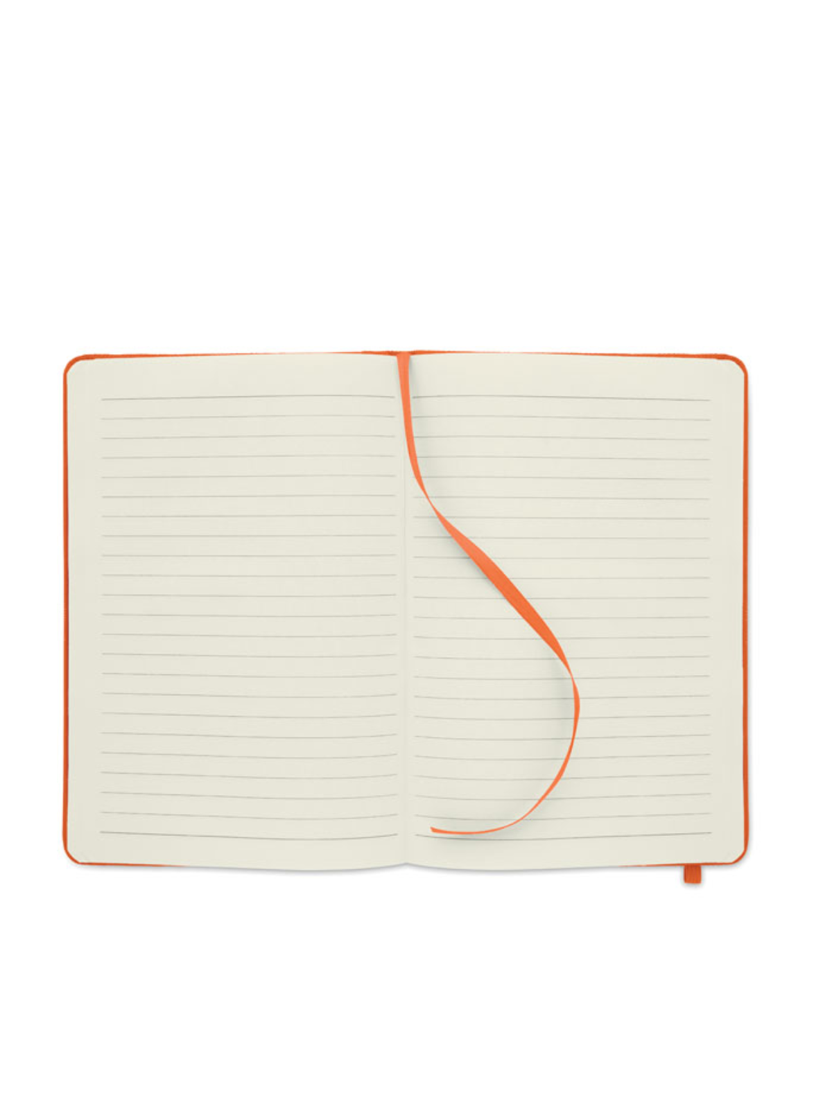 Notebook A5 con copertina rigida in RPET 600D. 160 pagine di carta riciclata a righe (80 fogli). Cinturino di chiusura elastico in tono e segnalibro in nastro.