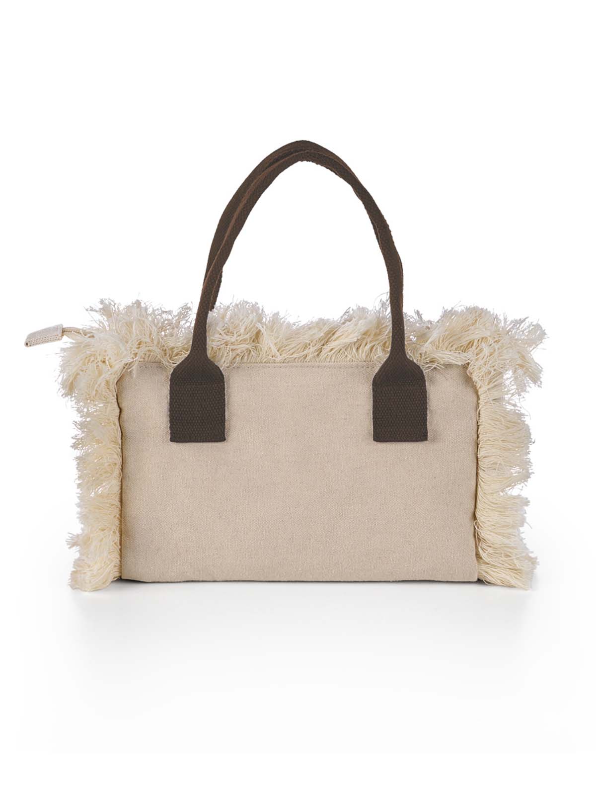 Borsa mini con frange decorative, doppi manici corti, chiusura a zip e fodera interna.