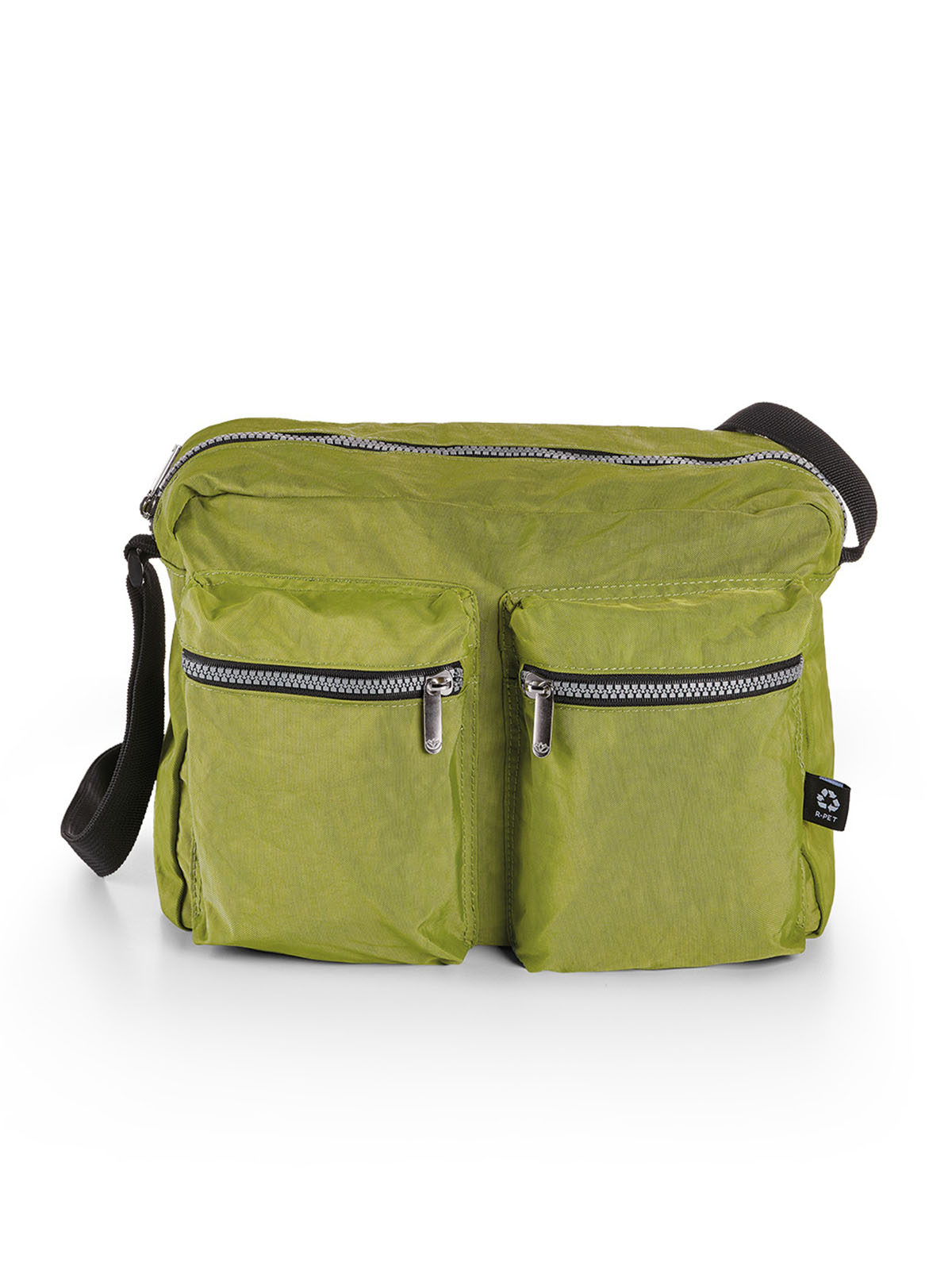 Borsa con tracolla regolabile, doppia tasca esterna con zip e piccola tasca interna portaoggetti.
