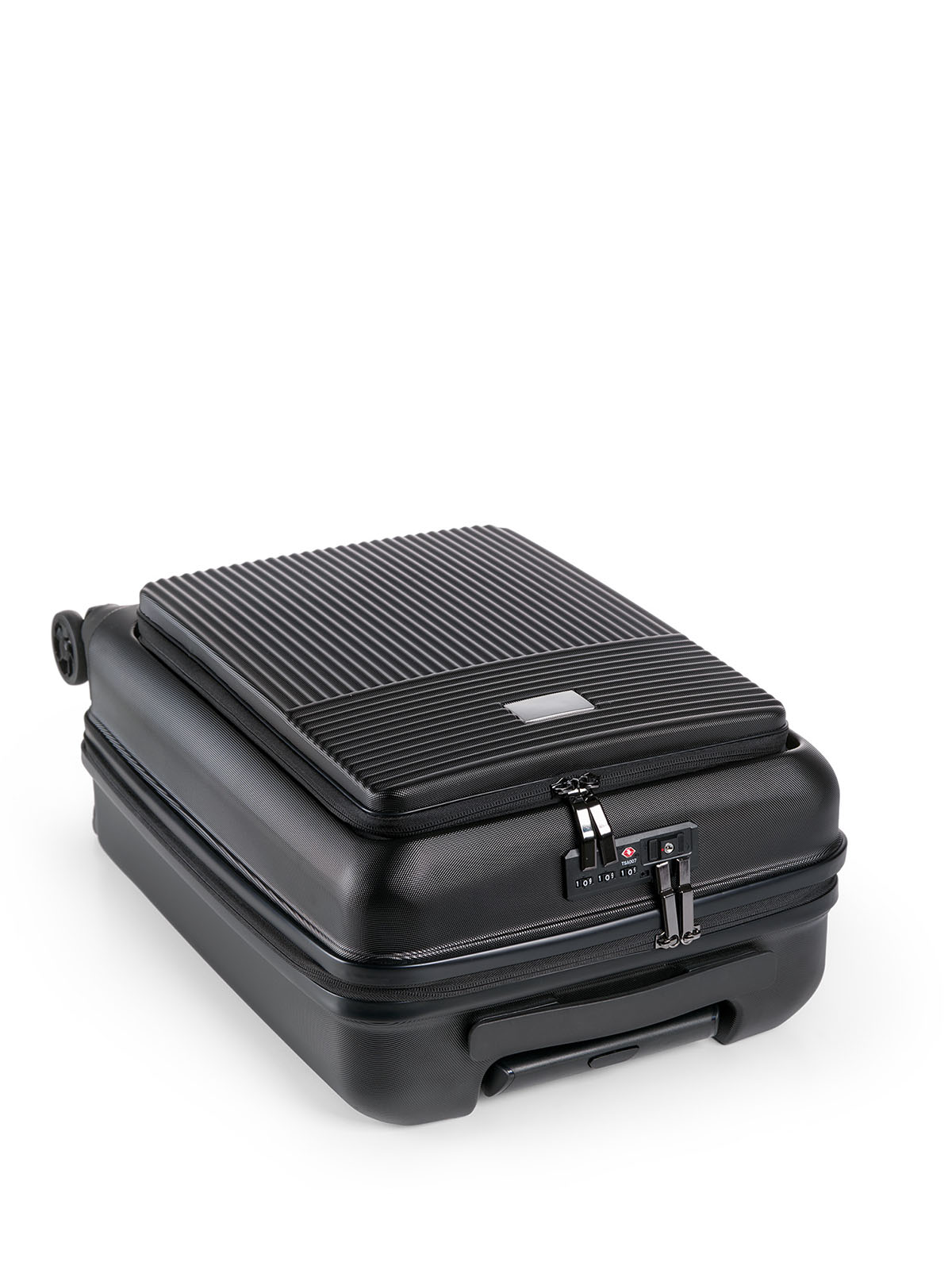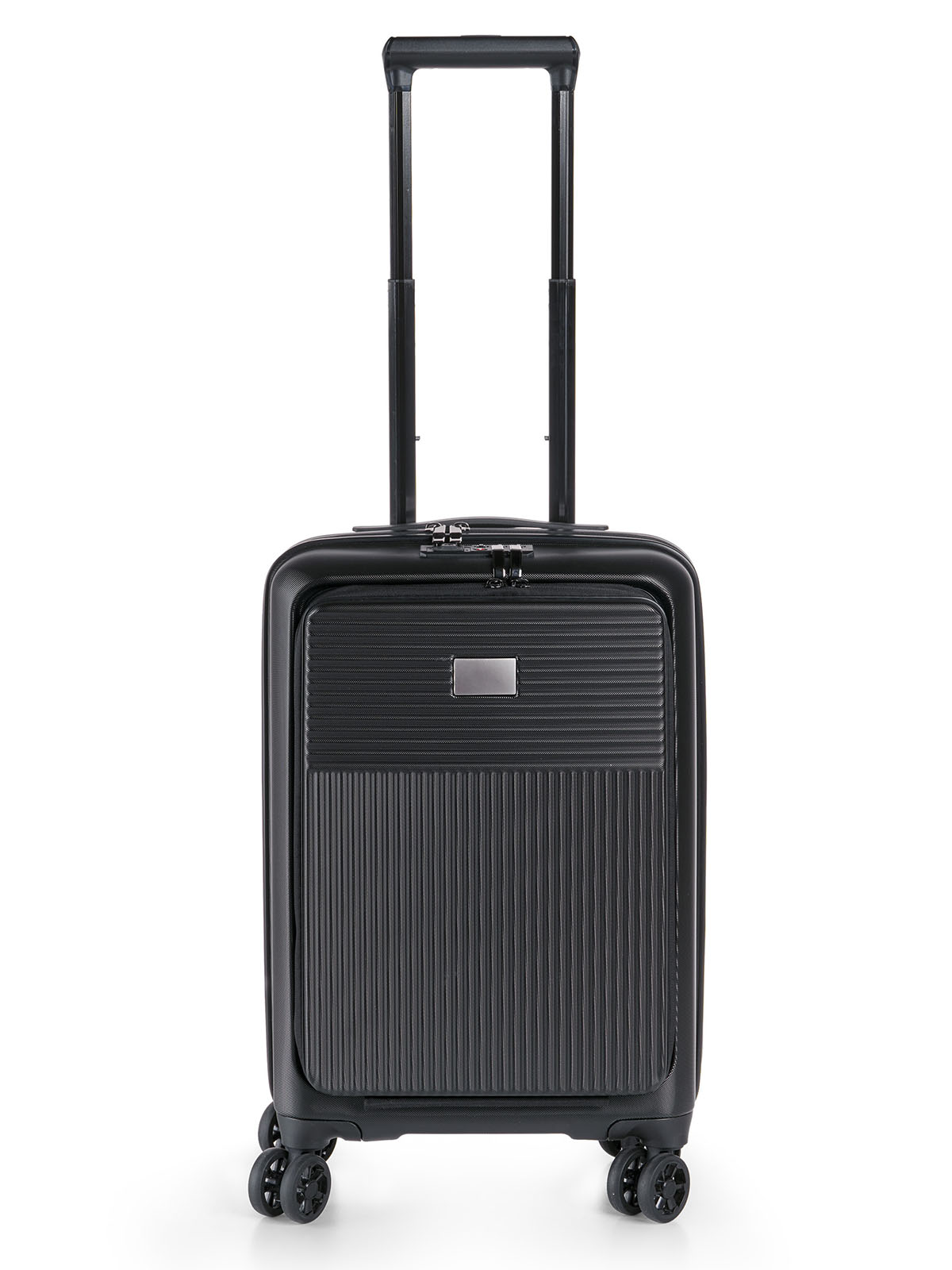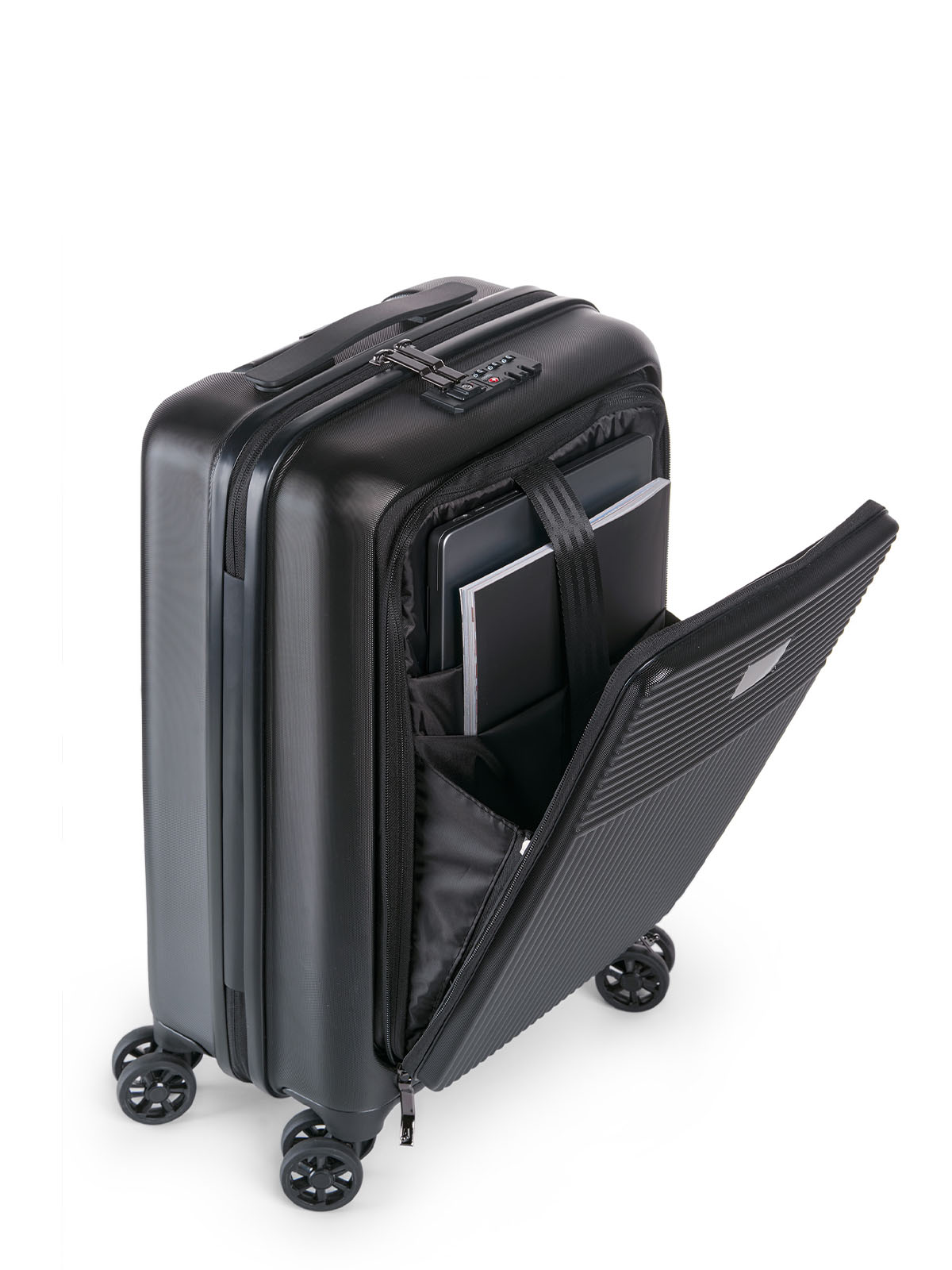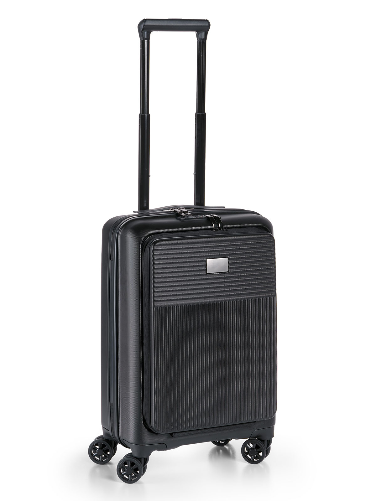 Trolley cabina con tasca poirta pc esterna dotata di organizer interno. Chiusura con zip e lucchetta TSA a tripla combinazione incorporato. Quattro ruote piroettanti e multidirezionali. Interno dotato di fodera con specifici scomparti biancheria e porta abiti. Carrello in alluminio doppio scatto e push botton. Personalizzabile sulla targhetta in metallo esterna.