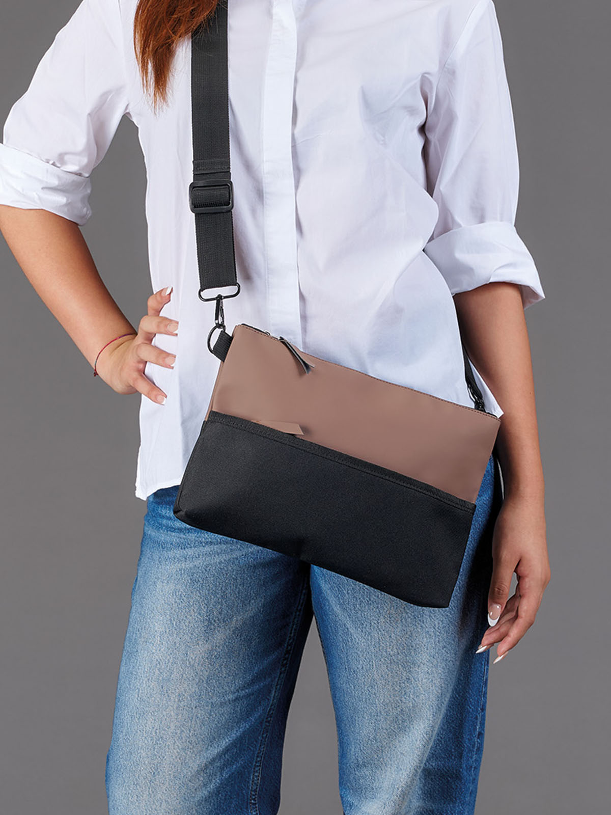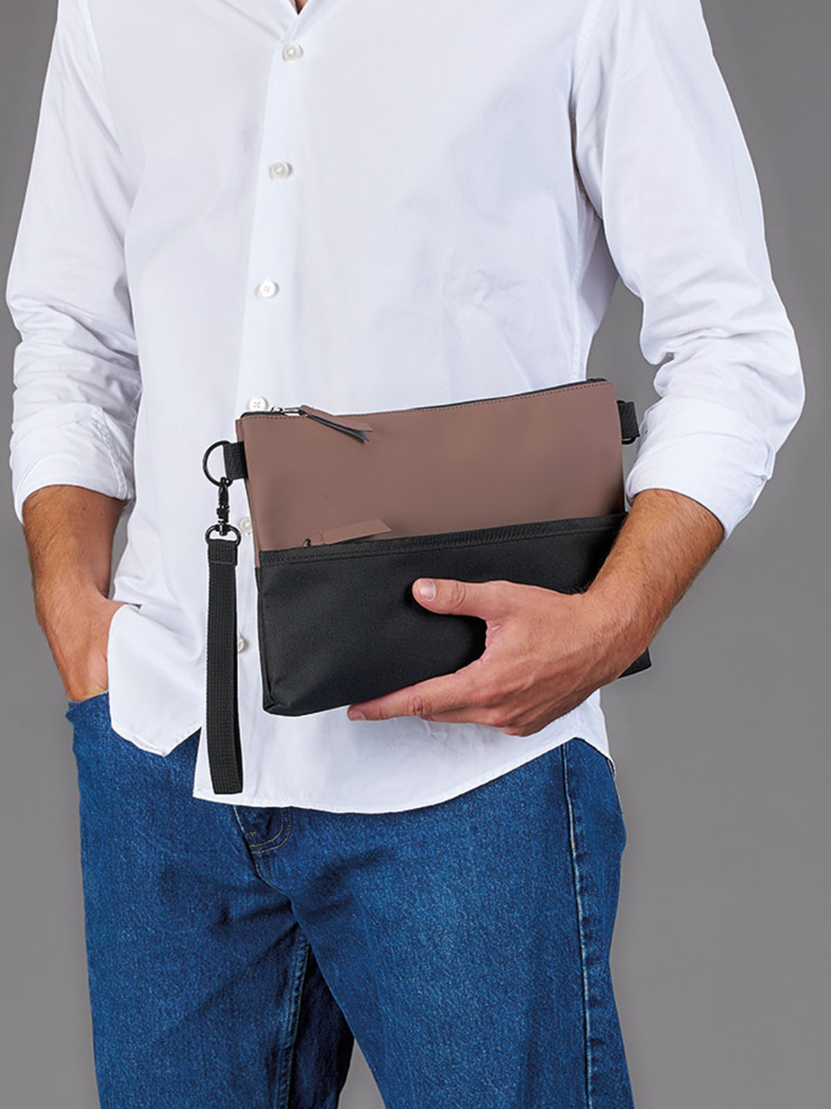 Borsa con tracolla regolabile e staccabile, utilizzabile come beauty o portadocumenti con laccio, rimuovendo la tracolla. Tasca frontale con zip e piccola tasca interna.