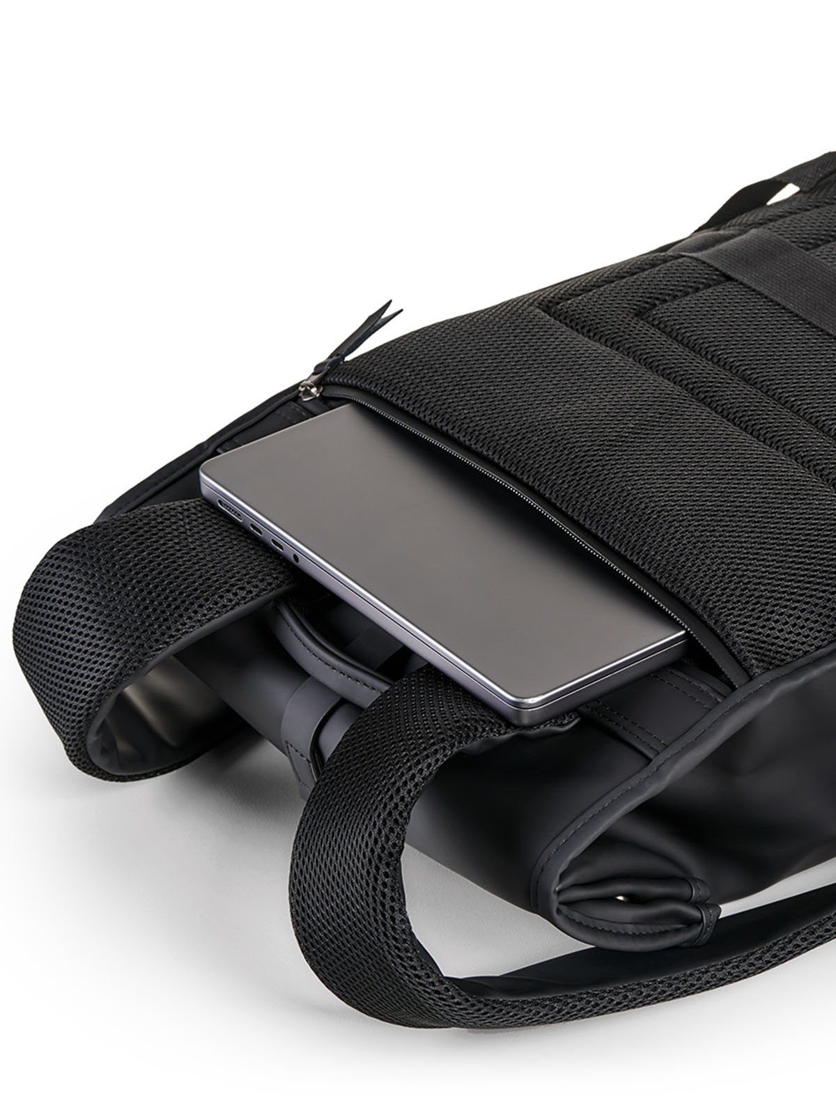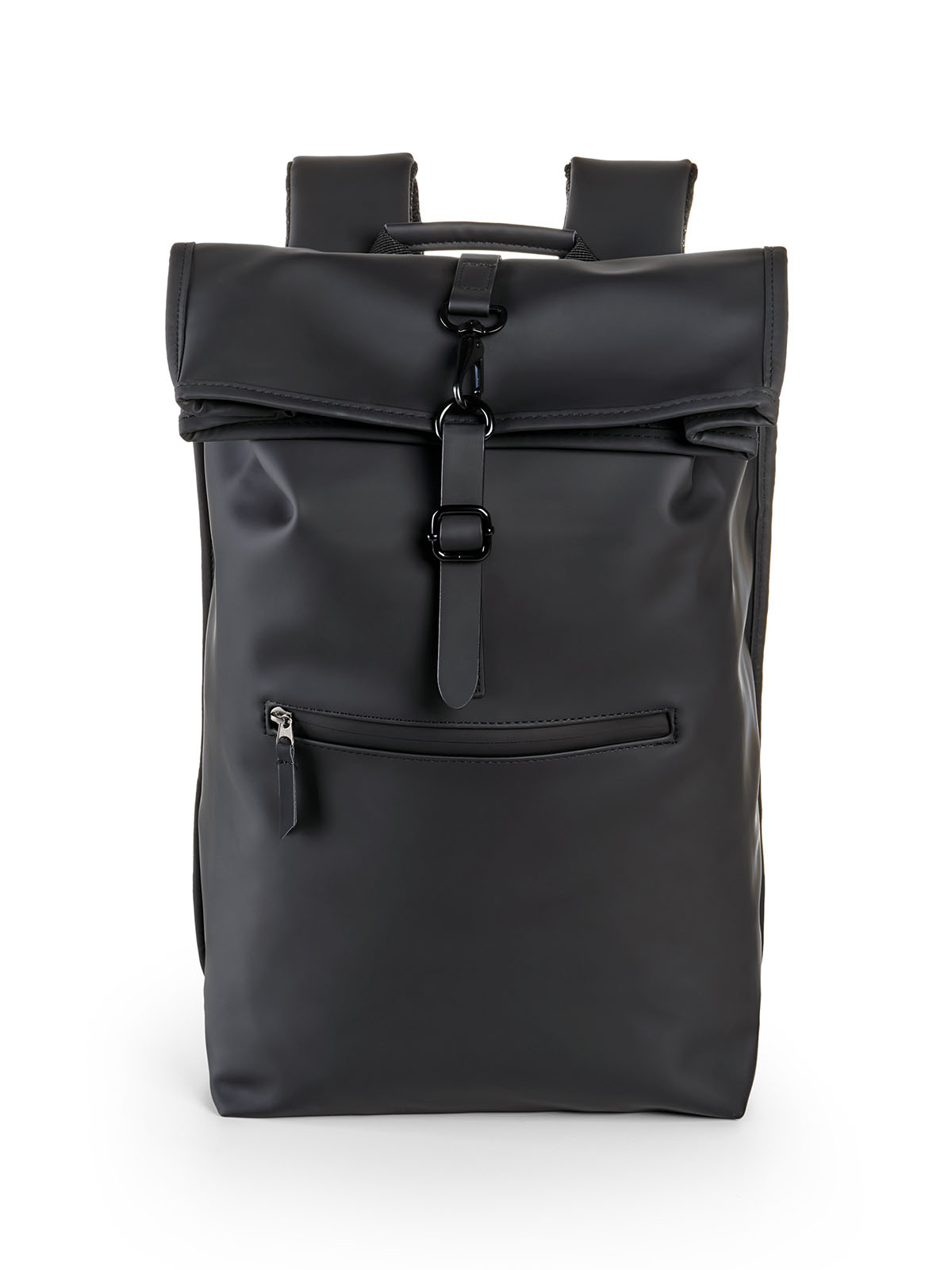 Zaino con effetto soft-touch con chiusura con gancio e tasca frontale con zip. Soffietto con bottone di chiusura. Retro imbottito con tasca porta pc e fascia per il trolley, spallacci ergonomici e imbottiti.
