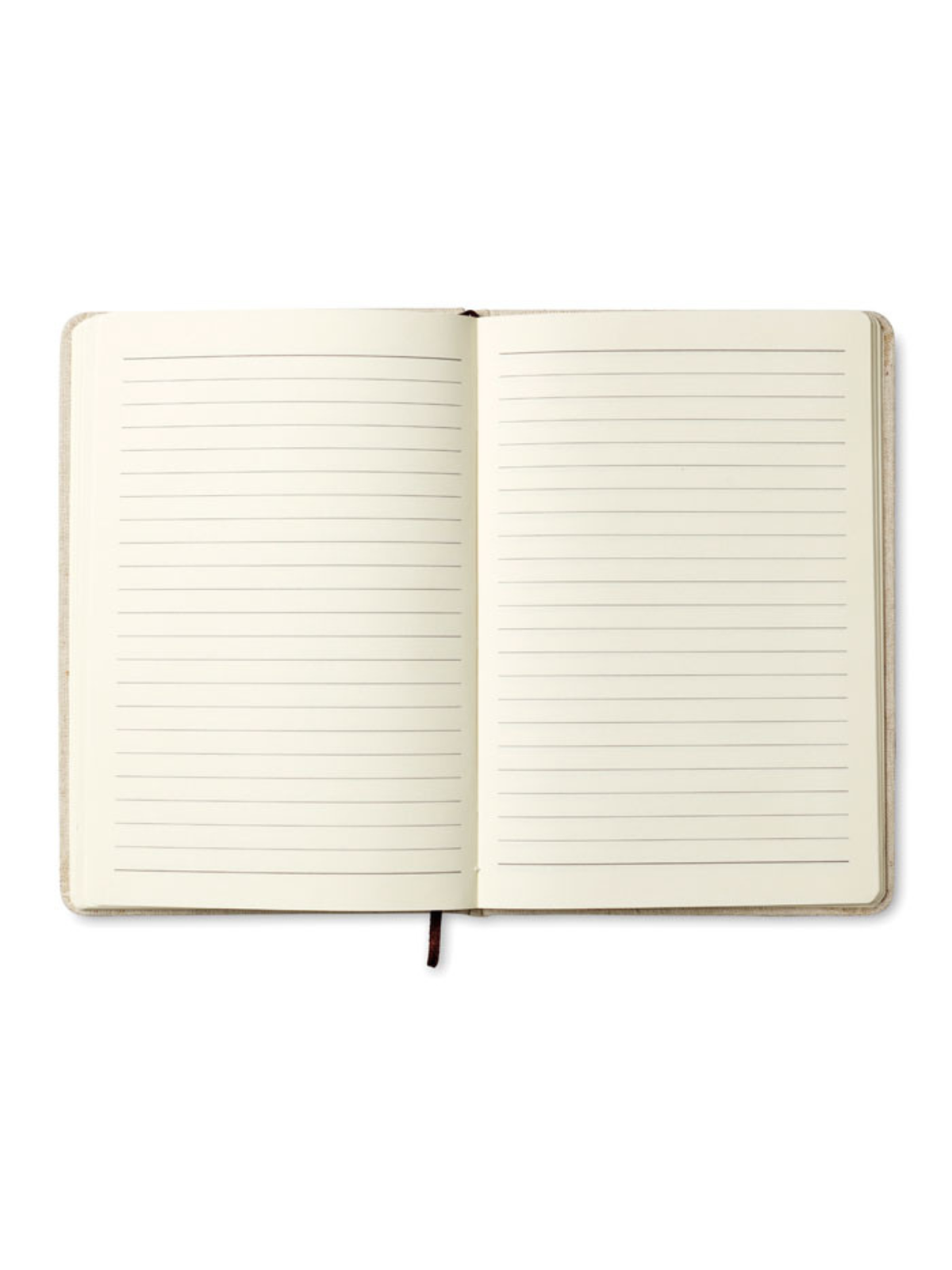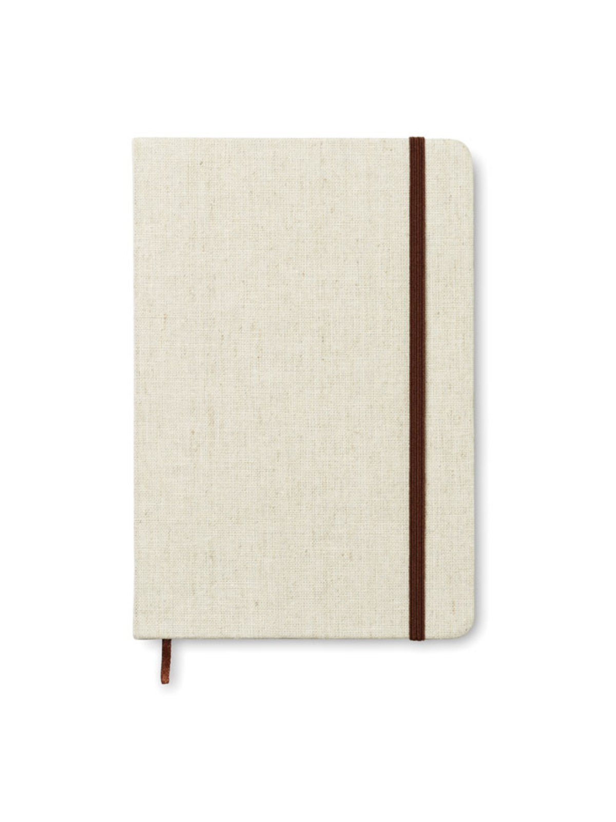 Notebook A5 con copertina rigida in tela. 192 pagine riciclate a righe (96 fogli). Chiusura con elastico a strappo e nastro segnapagina a contrasto.