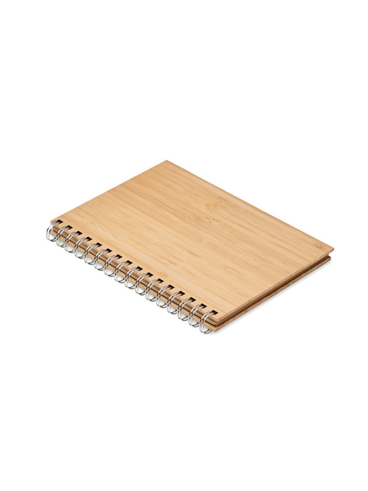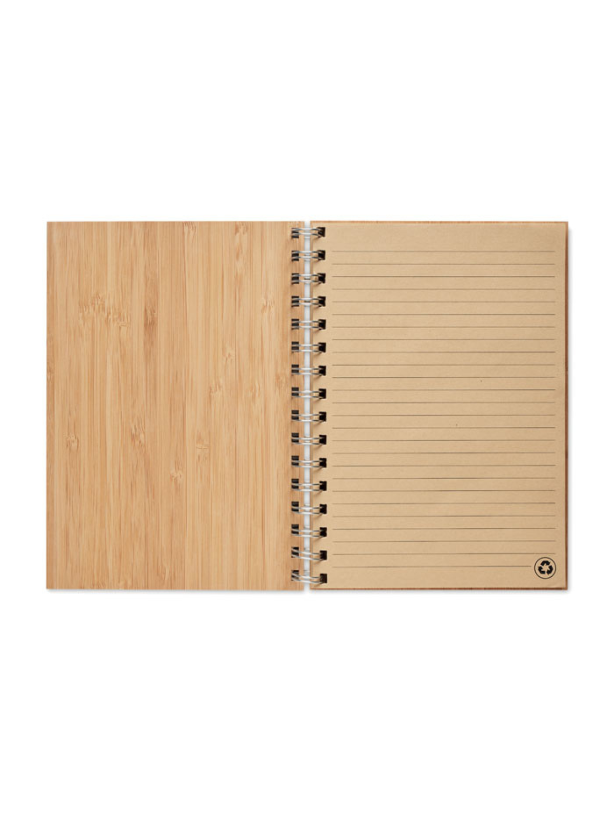 Notebook con copertina in bamboo. Rilegato ad anelli a doppio filo, 140 pagine in carta kraft a righe (70 fogli).