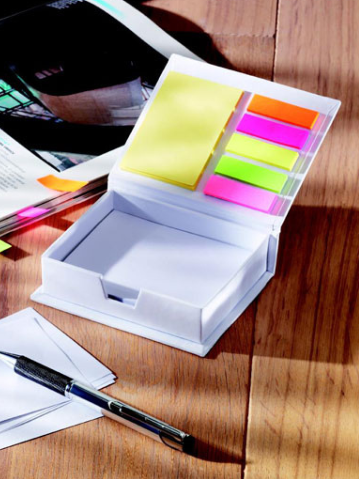 Set memo per appunti in cartone. Blocco note da 100 fogli. Blocco note adesive da 2 pezzi, gialli medi e 5 segnapagina in colori assortiti.