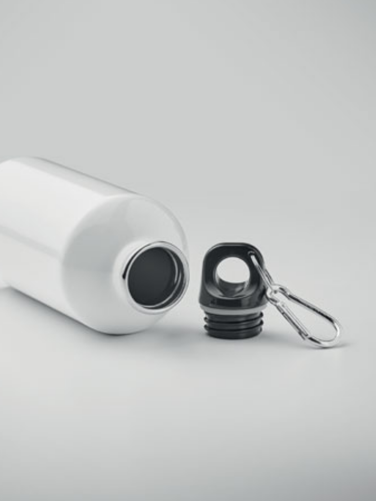 Bottiglia monostrato in acciaio inox riciclato (90% acciaio inox riciclato e 10% acciaio inox) con moschettone. Poiché si tratta di una bottiglia a parete singola, si può verificare la dispersione di calore.