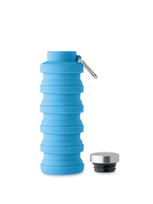 Bottiglia pieghevole in silicone con coperchio in acciaio inox e moschettone in alluminio. Il moschettone non è adatto all'arrampicata (uso non professionale).