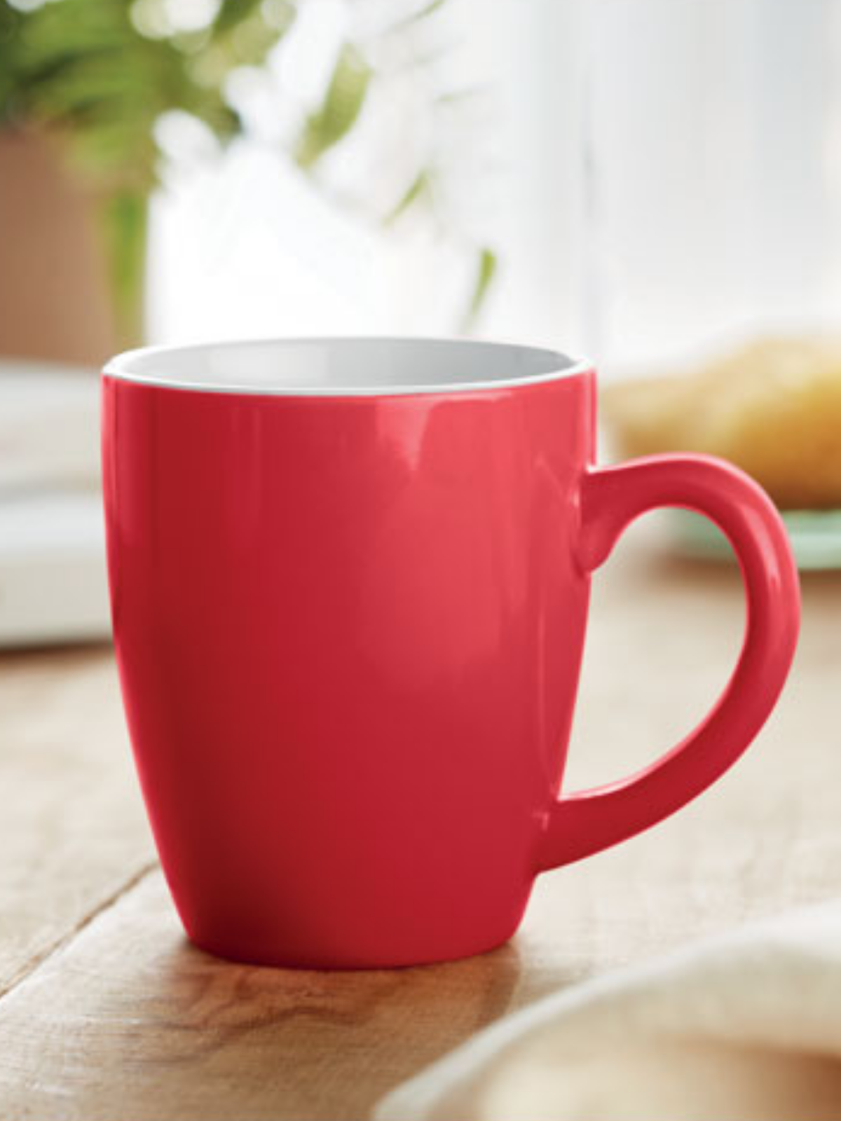 Tazza in ceramica bicolor con scatolina in cartoncino bianco.