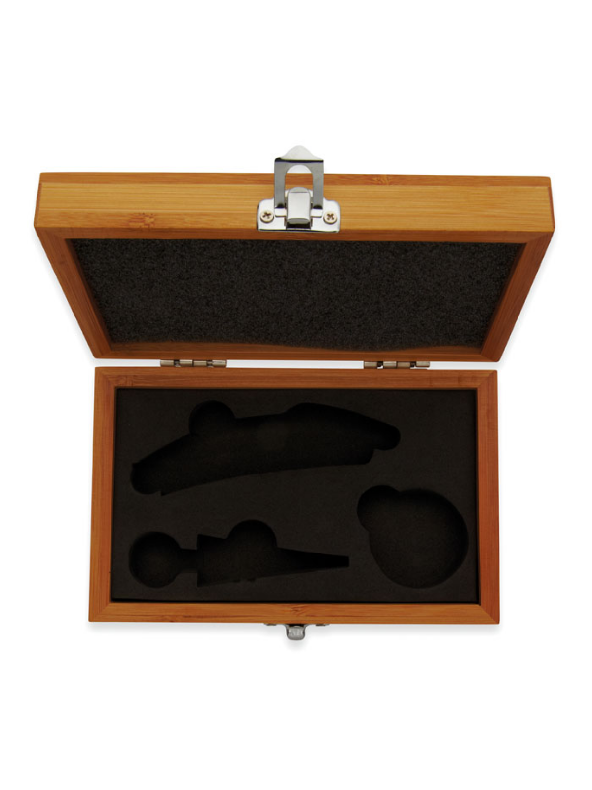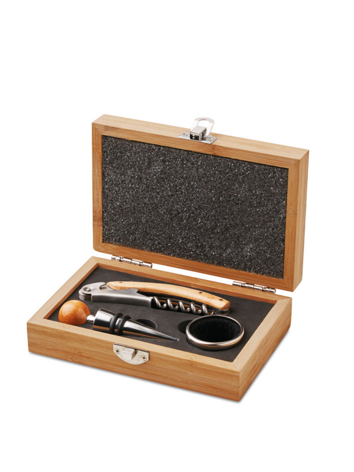 Set vino in scatola di bamboo che comprende un salvagoccia, un cavatappi, un tappo in acciaio inossidabile e bamboo.