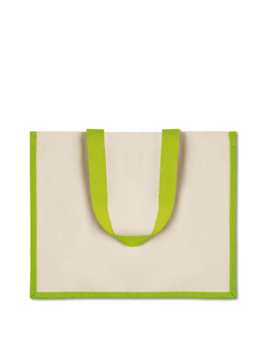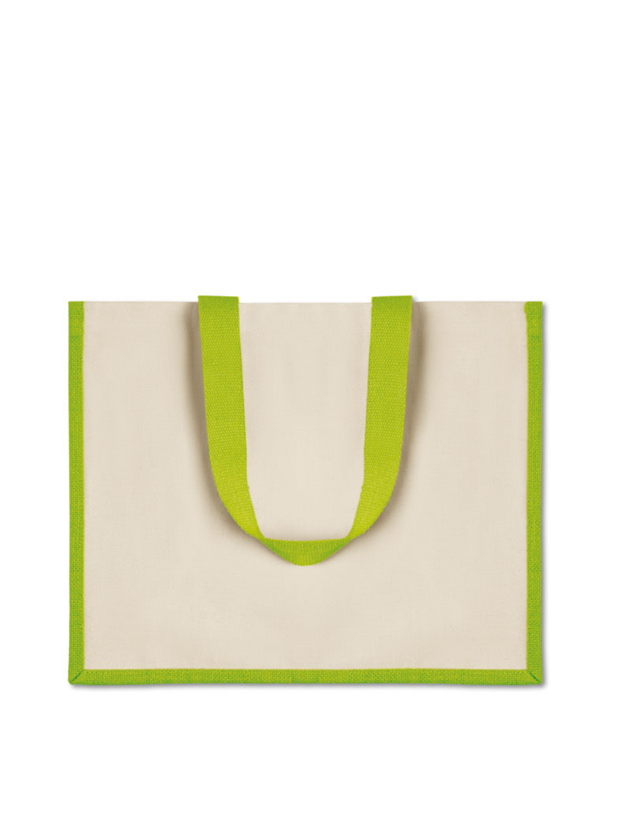Shopper con soffietto in juta con interno laminato, fronte e retro in canvas e manici piatti in cotone. Questo prodotto è certificato OEKO-TEX® STANDARD 100.