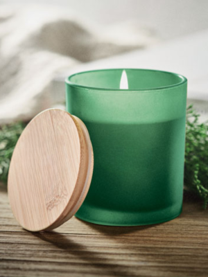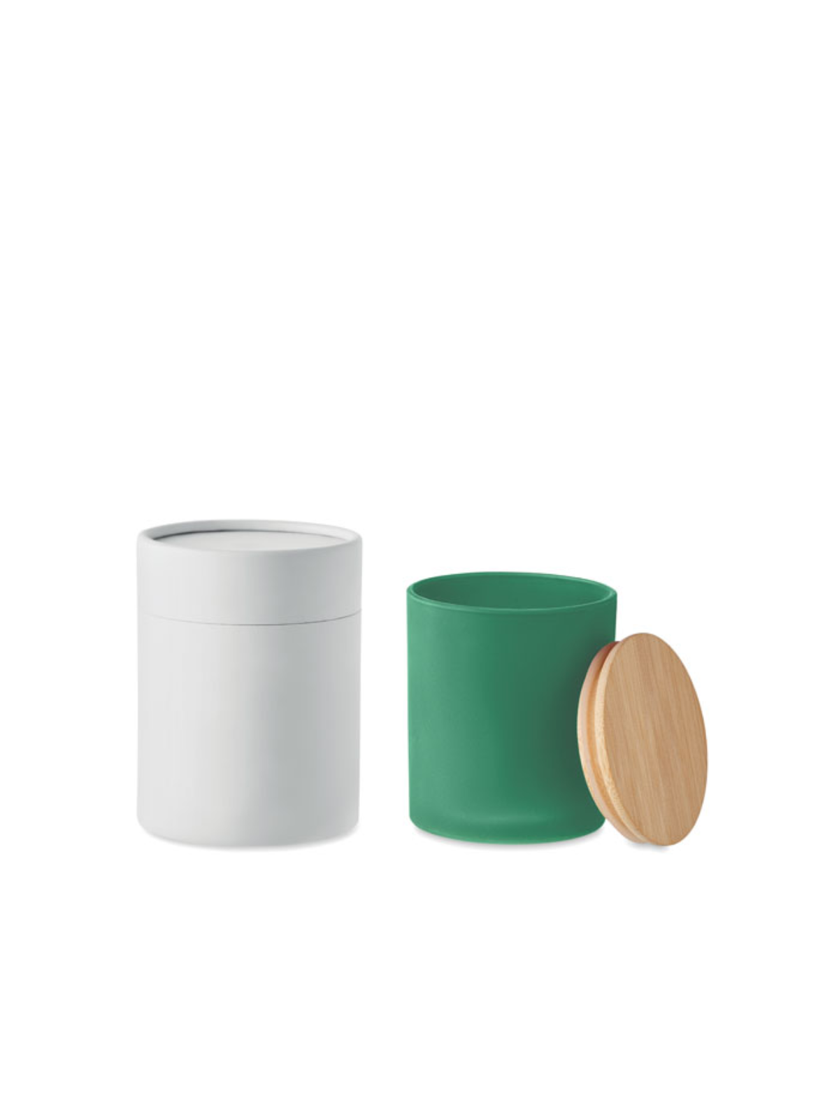 Candela di cera vegetale alla vaniglia, legno di sandalo o gelsomino in barattolo di vetro opaco con coperchio di bamboo. 120 gr. Durata candela: 20 ore.