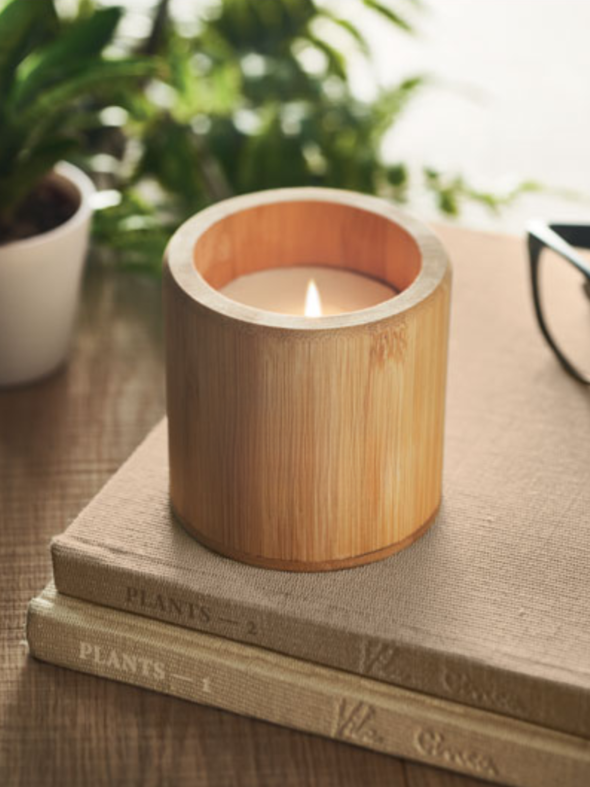Candela di cera vegetale con profumo di vaniglia in supporto di bamboo. 160 g/m². Tempo di combustione: 30 ore. Il bamboo è un materiale naturale e può avere delle variazioni leggere di colore, dimensione e stampa.