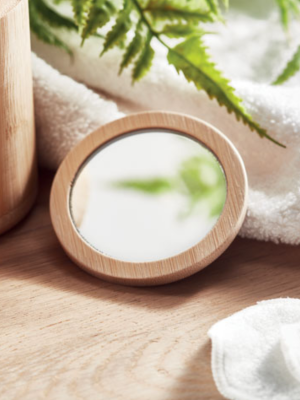 Specchio da trucco rotondo in bambù. È presentato in un sacchetto di cotone con cordoncino. Il bambù è un prodotto naturale, ci possono essere leggere variazioni di colore e dimensioni per ogni articolo, che possono influenzare il risultato finale della personalizzazione. FSC®-certified | FSC 100%, N5.7, FSC-C213206