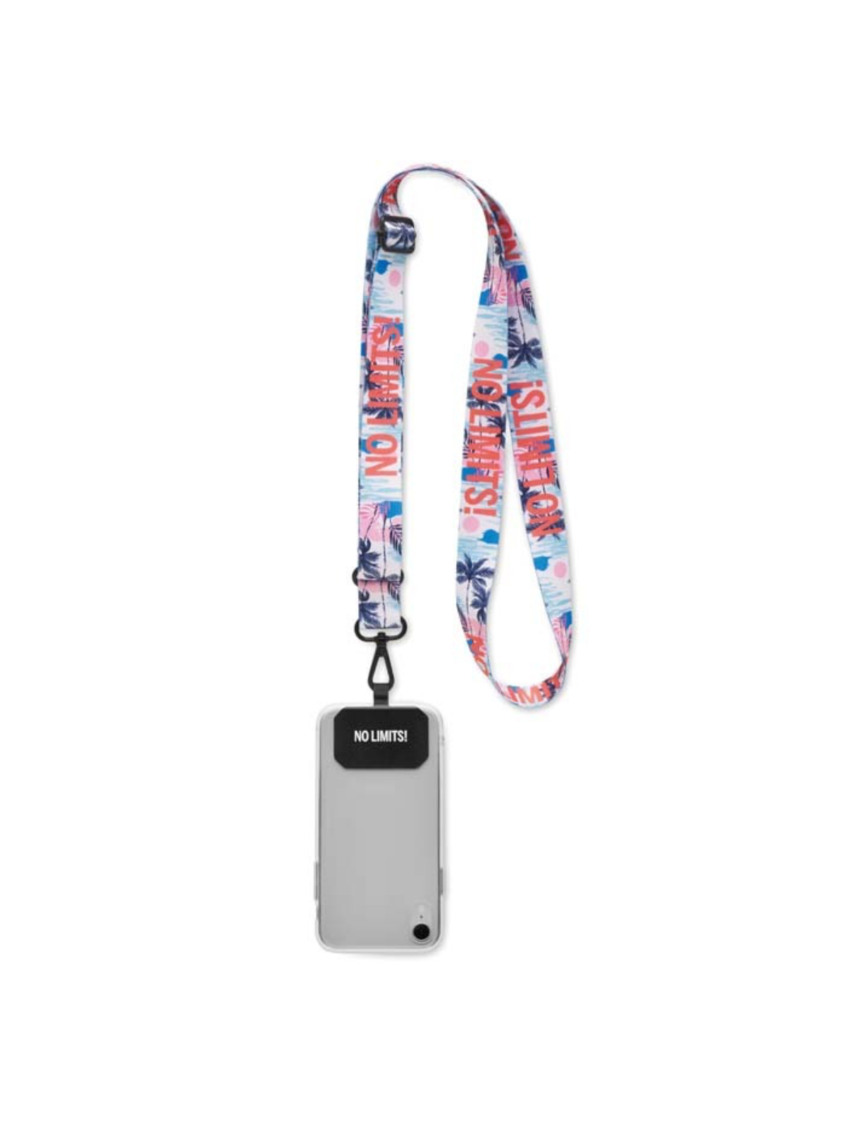 Portacellulare a tracolla regolabile e sublimato con gancio e accessori neri. La patch è disponibile in 12 colori standard e personalizzabile con logo.