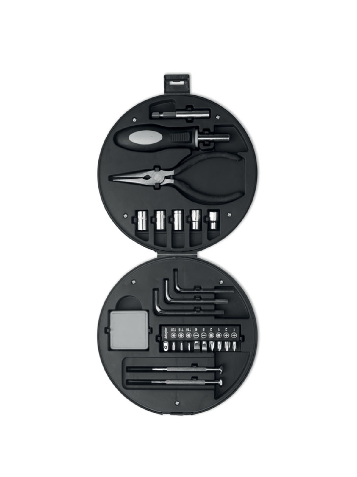 Set attrezzi 25 pezzi in confezione a forma di ruota. 1 prolunga, 1 cacciavite a bussola con 5 teste, 1 pinza ad ago, 3 chiavi a brugola, set 10 punte, 2 cacciaviti di precisione e 1 nastro adesivo.