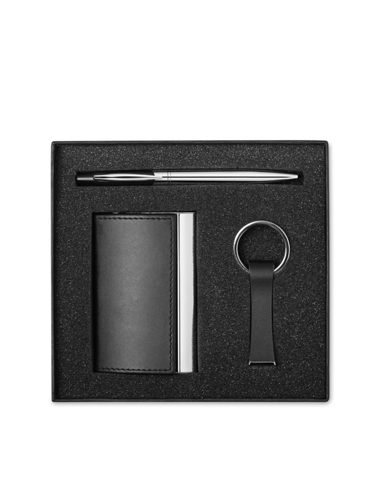 Set business in confezione regalo nera composto da: 1 penna a sfera (refill nero), 1 portachiavi in PU e lega di zinco e 1portabiglietti da visita.