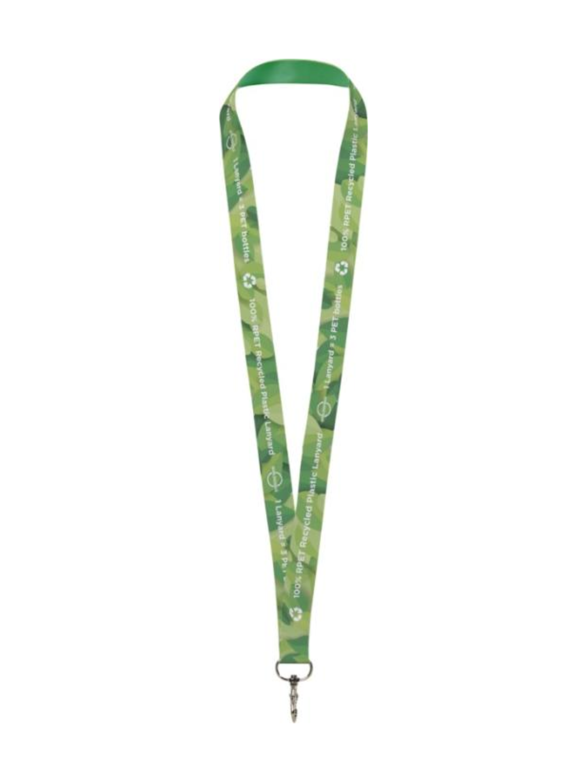 Lanyard in PET riciclato, con stampa in sublimazione e gancio metallico. Disponibile con stampa full color su uno o due lati. Può contenere badge, carte d'identità o chiavi. Disponibile in 4 diverse misure: 10, 15, 20 e 25 mm.