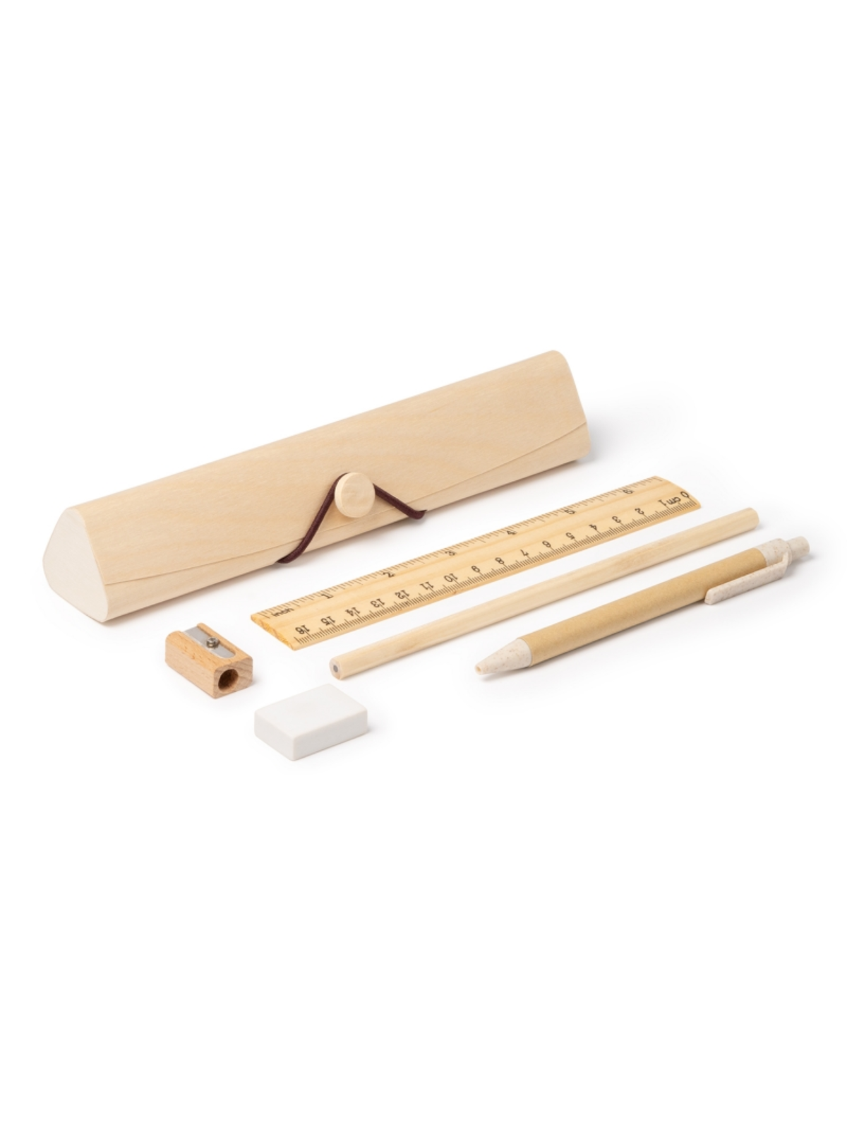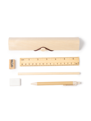 Set scrittura in legno naturale con custodia in legno Include: righello, matita, penna a sfera in cartoncino riciclato, gomma e temperino
