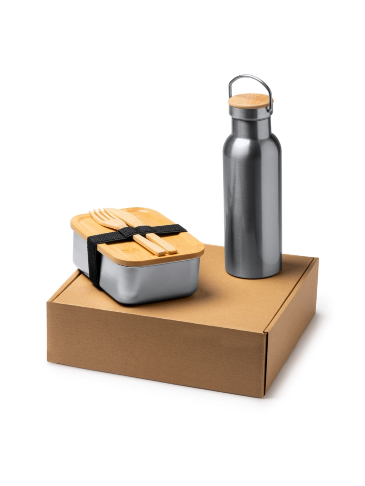 Set pranzo composto da portapranzo e borraccia. Portapranzo in acciaio inox 304, capacità 800ml, con coperchio in bambù con fascia elastica di chiusura. Include posate in bambù (forchetta e coltello). Borraccia in acciaio inox 304, con tappo a vite con inserto in bambù. Capacità 500ml. Fornito in confezione singola.